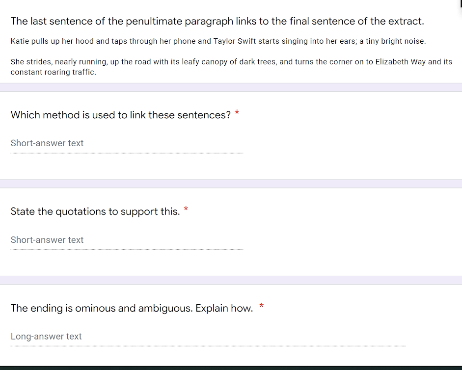 One of the major issues we have had over the last few years is our students being unable to form their own opinions on a text. This undoubtedly stems from a previously poor curriculum that was focused on teaching to the exam (before my time) and is something our new curriculum is designed to target but is going to take a few years to filter through the year groups. My thinking here was that we could use this time at home to expose students to various fiction extracts and non-fiction texts linked by their key concepts. We began with Atwood’s ‘The Blind Assassin’ and linked the theme of suicide to an article about mental health issues during the pandemic. Forms enables us to pose questions that explore key language and structural ideas so that students are analysing without even realising it.